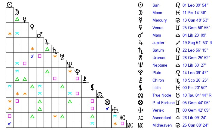 | Moon | 11 Pisces 15 | 0 Leo 46 | 14 Capricorn 1 |