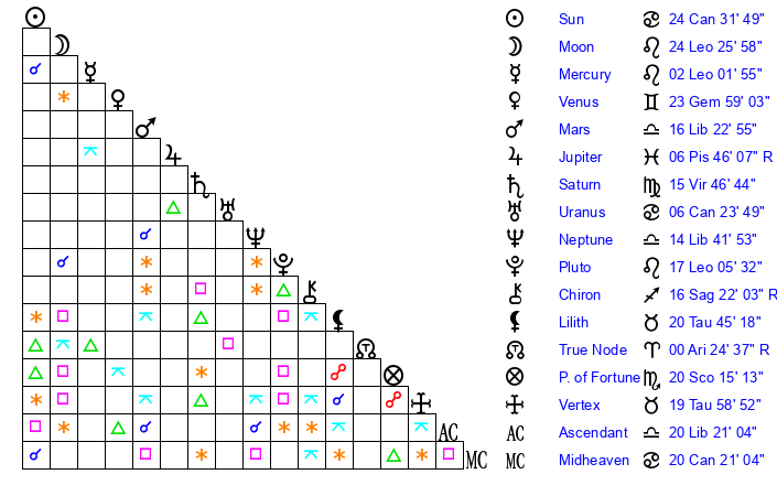 | Sun | 24 Cancer 31 | 25 Cancer 22 | 6 Libra 57 |