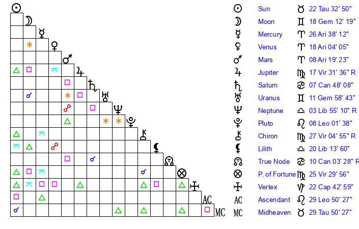 | Moon | 18 Gemini 12 | 4 Sagittarius 13 | 19 Taurus 7 |