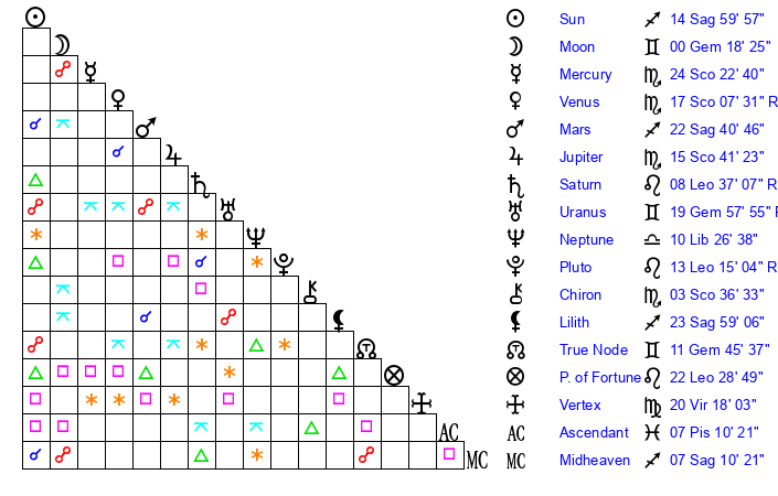 | Moon | 0 Gemini 19 | 23 Cancer 58 | 18 Aries 48 |