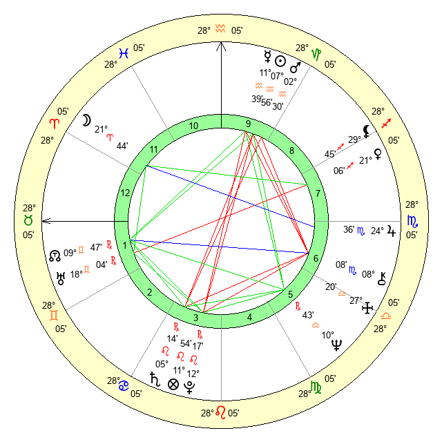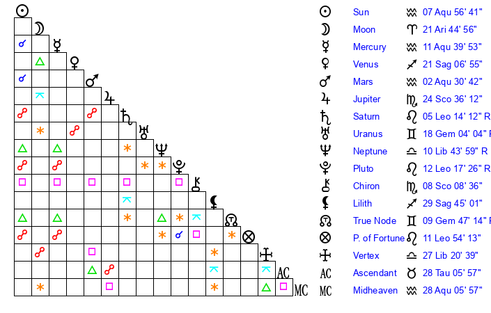 | Sun | 7 Aquarius 57 | 9 Aquarius 2 | 25 Aries 52 |
