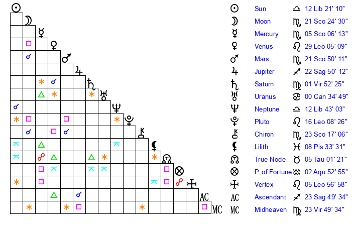 | Moon | 21 Scorpio 23 | 22 Pisces 50 | 9 Virgo 45 |