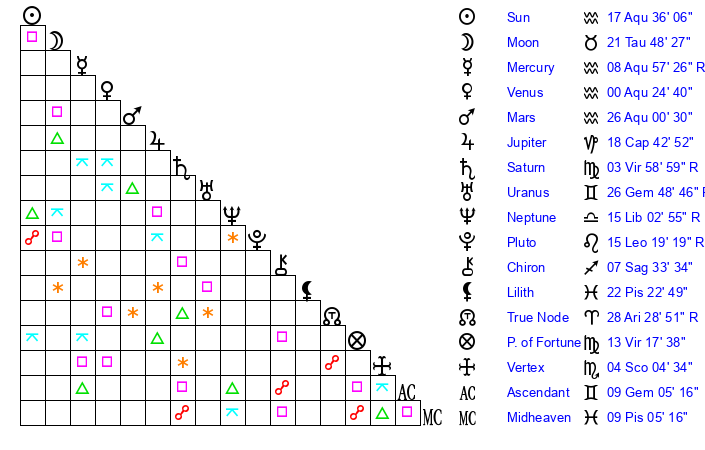 | Sun | 17 Aquarius 36 | 18 Aquarius 9 | 3 Taurus 12 |