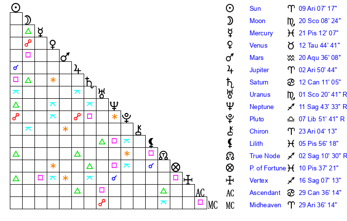 Moon | 20 Scorpio 4 | 24 Aries 8 | 11 Virgo 31 |