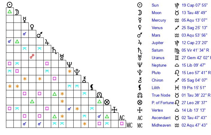 | Moon | 13 Taurus 47 | 8 Libra 44 | 15 Pisces 48 |