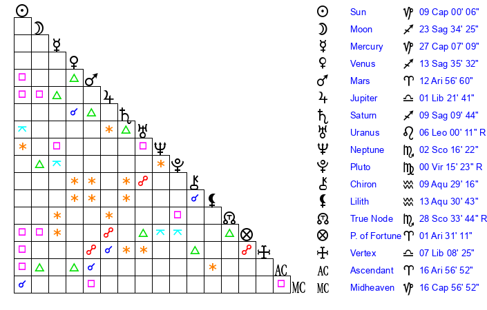 | Mars | 12 Aries 56 | 11 Capricorn 42 | 24 Taurus 51 |