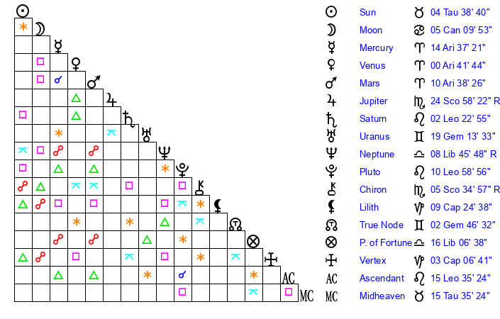 | Moon | 5 Cancer 13 | 6 Aries 0 | 4 Taurus 47 |