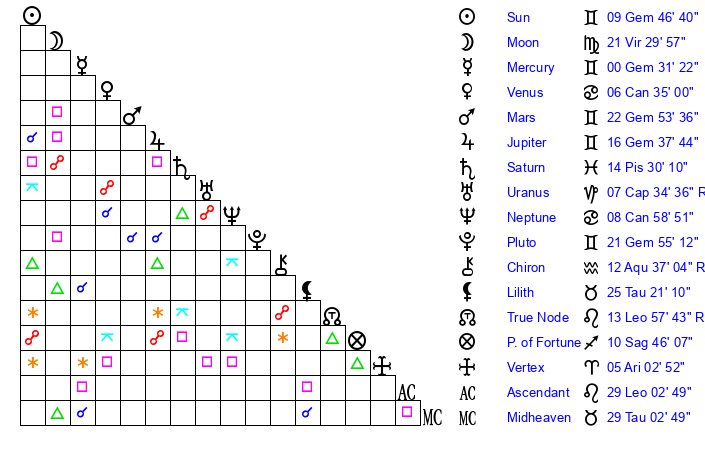 | Pluto | 21 Gemini 56 | 3 Aquarius 38 | 23 Gemini 46 |
