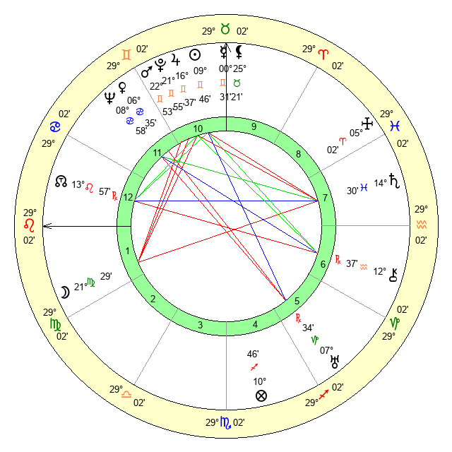 | Moon | 21 Virgo 29 | 18 Leo 16 | 11 Aquarius 45 |