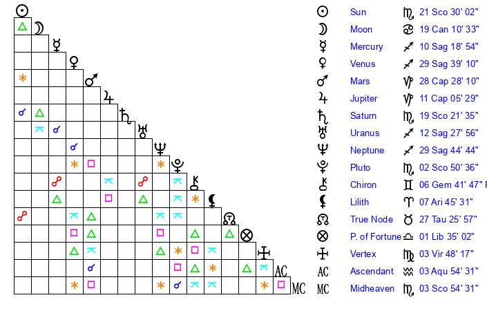 | Saturn | 19 Scorpio 39 | 25 Pisces 14 | 24 Scorpio 17 |