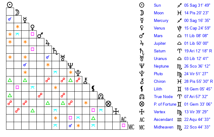| Sun | 5 Sagittarius 32 | 5 Sagittarius 42 | 3 Aquarius 32 |