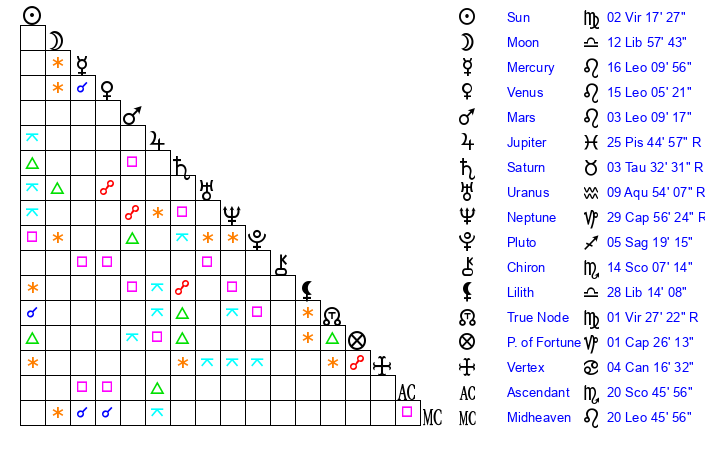 | Mercury | 16 Leo 9 | 16 Leo 6 | 25 Virgo 0 |