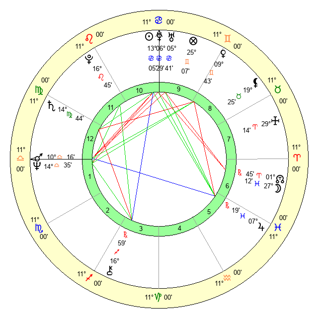 | Sun | 13 Cancer 5 | 13 Cancer 55 | 25 Virgo 12 |