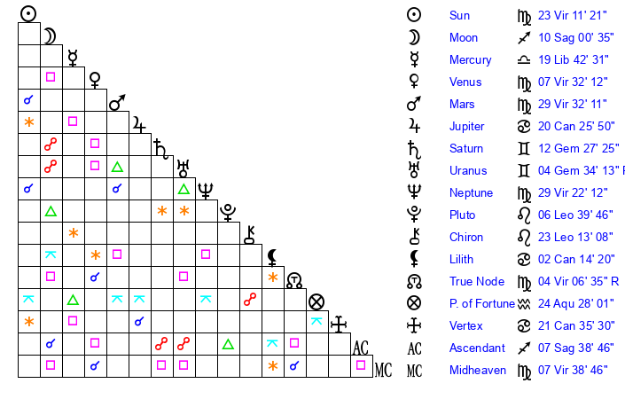 | Sun | 23 Virgo 11 | 24 Virgo 5 | 15 Sagittarius 59 |