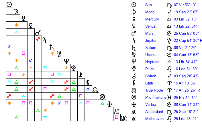 | Moon | 19 Sagittarius 24 | 13 Sagittarius 23 | 19 Virgo 30 |