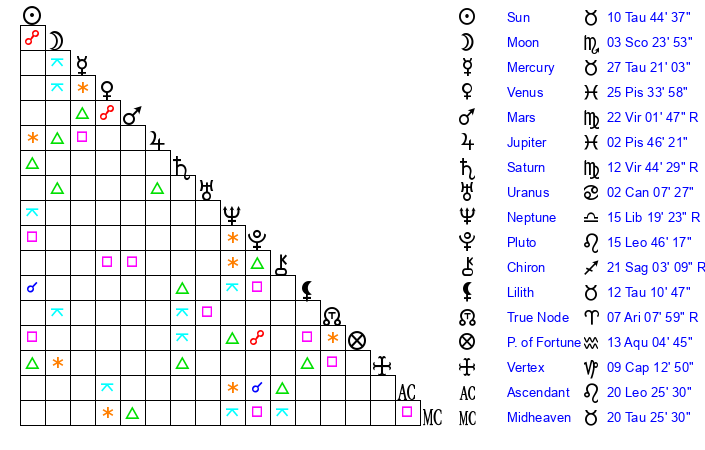 | Saturn | 13 Virgo 17 | 27 Pisces 50 | 16 Virgo 5 |