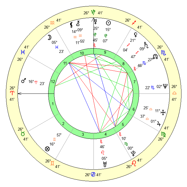 | Moon | 5 Pisces 25 | 16 Leo 8 | 19 Virgo 27 |