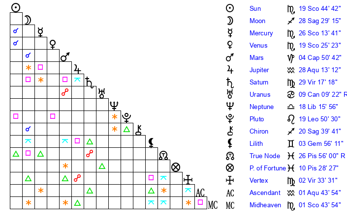 | Sun | 19 Scorpio 45 | 20 Scorpio 34 | 5 Aquarius 56 |
