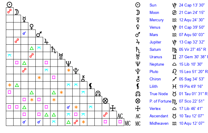| Neptune | 15 Libra 10 | 27 Pisces 32 | 13 Libra 53 |