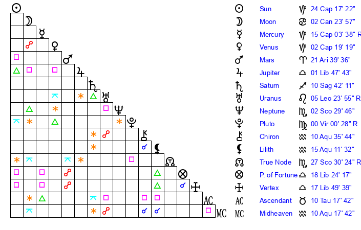 | Venus | 2 Capricorn 19 | 11 Pisces 52 | 27 Pisces 13 |