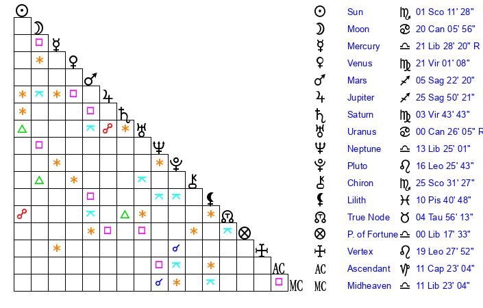 | Moon | 19 Cancer 59 | 6 Sagittarius 19 | 13 Taurus 47 |