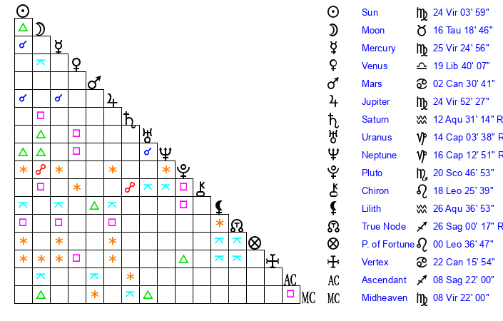 | Moon | 16 Taurus 18 | 22 Cancer 59 | 3 Leo 24 |