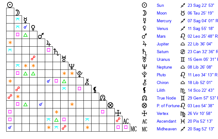 | Sun | 23 Sagittarius 23 | 23 Sagittarius 58 | 14 Pisces 32 |