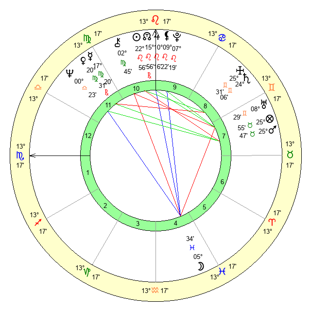 | Mercury | 17 Virgo 21 | 5 Leo 57 | 11 Scorpio 6 |
