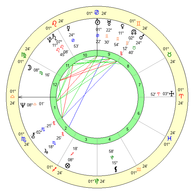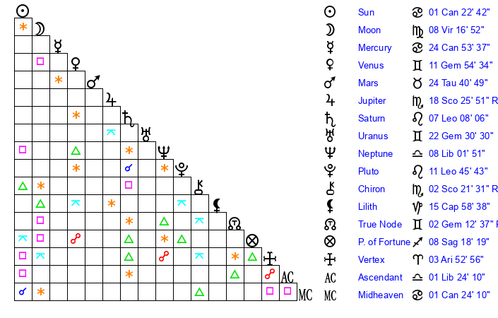 | Moon | 8 Virgo 23 | 8 Gemini 40 | 6 Cancer 20 |