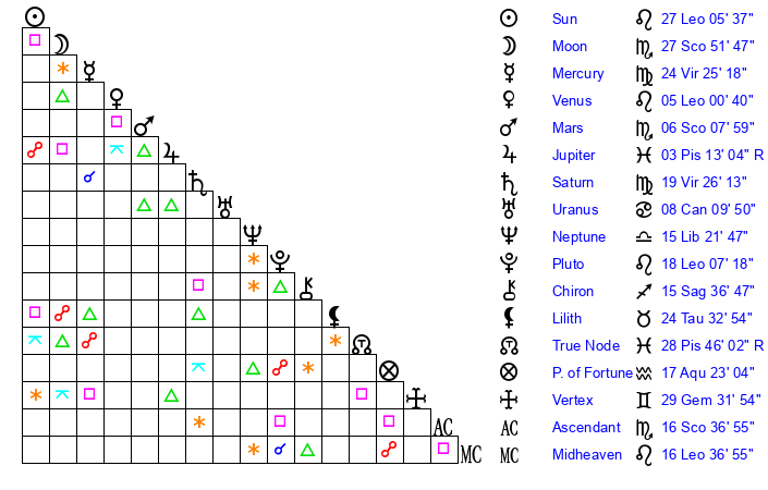 | Moon | 27 Scorpio 50 | 26 Cancer 17 | 18 Leo 25 |
