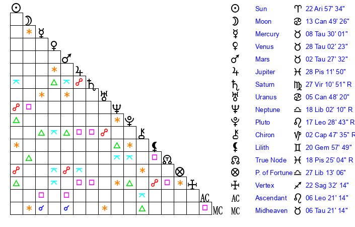 | Saturn | 27 Virgo 45 | 25 Pisces 54 | 26 Virgo 45 |