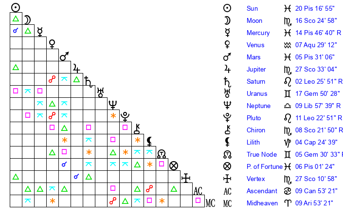 | Moon | 16 Scorpio 22 | 22 Leo 9 | 25 Virgo 43 |