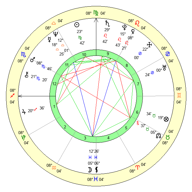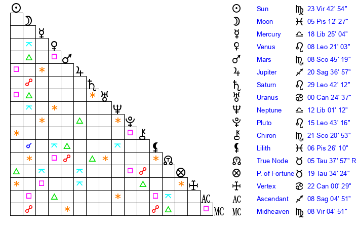 | Saturn | 0 Virgo 8 | 28 Pisces 44 | 6 Virgo 30 |