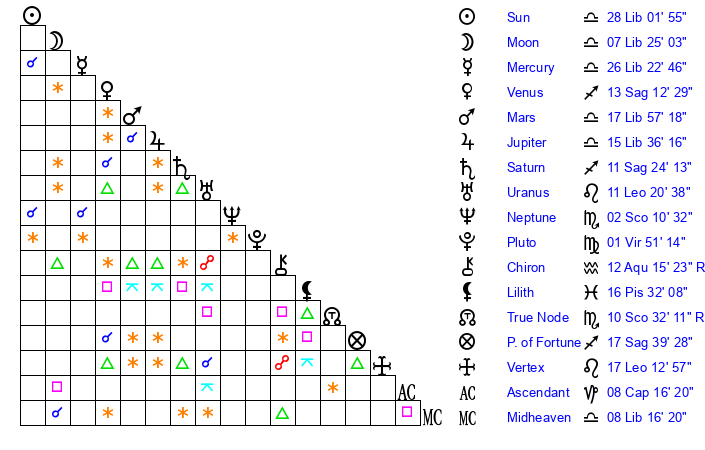 | Mercury | 26 Libra 23 | 21 Scorpio 1 | 0 Capricorn 0 |