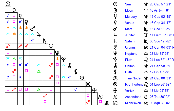 | Venus | 16 Capricorn 34 | 8 Pisces 53 | 15 Aries 25 |
