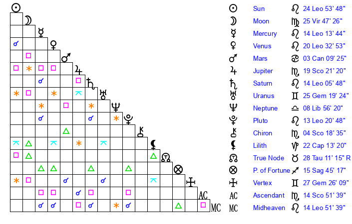 | Sun | 24 Leo 54 | 26 Leo 0 | 11 Scorpio 26 |