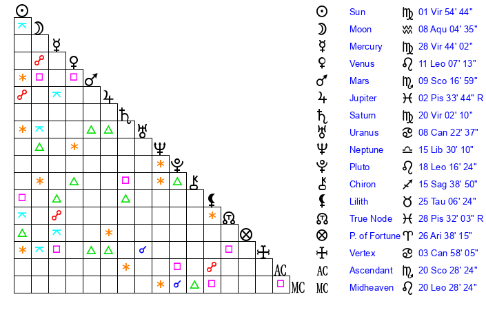 | Mercury | 28 Virgo 44 | 16 Leo 6 | 19 Scorpio 57 |