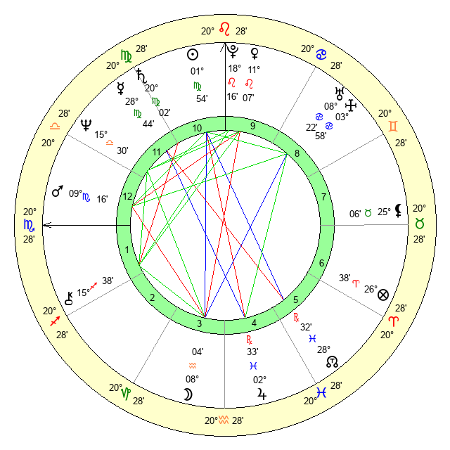 | Sun | 1 Virgo 54 | 2 Virgo 45 | 15 Scorpio 43 |