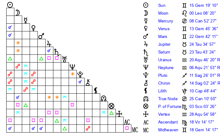| Mars | 22 Gemini 43 | 23 Leo 35 | 9 Cancer 28 |