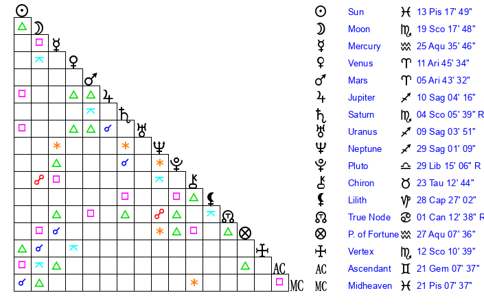 Venus | 11 Aries 46 | 10 Aries 43 | 2 Gemini 20 |