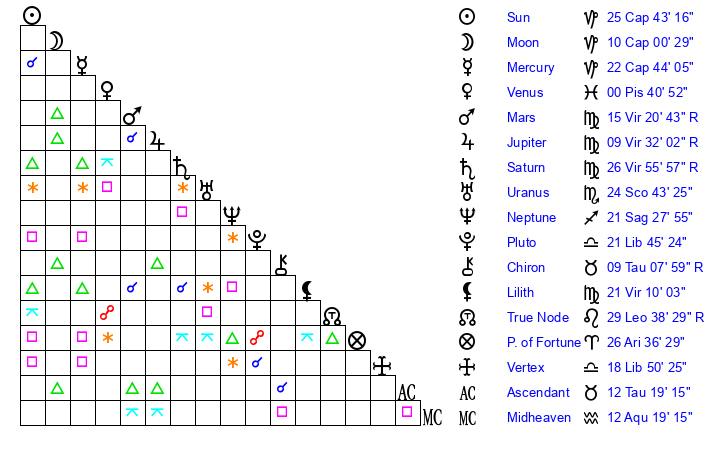| Mercury | 22 Capricorn 45 | 12 Capricorn 9 | 19 Pisces 49 |
