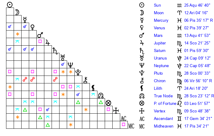 | Mars | 13 Aquarius 42 | 17 Cancer 34 | 8 Pisces 4 |