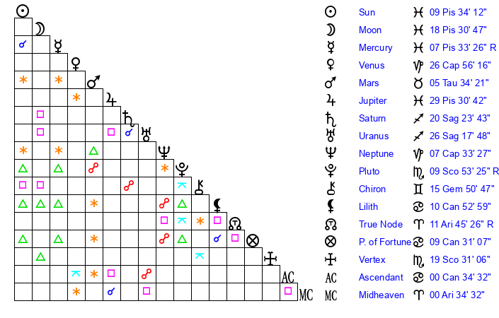 | Moon | 18 Pisces 30 | 19 Pisces 32 | 2 Leo 21 |