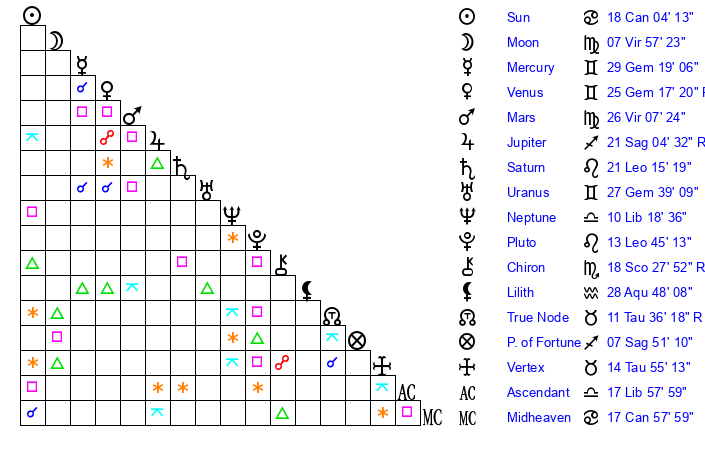 | Moon | 7 Virgo 56 | 13 Capricorn 47 | 22 Gemini 46 |