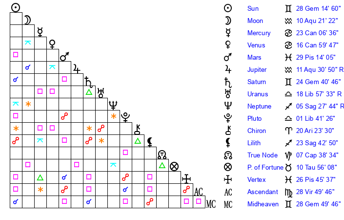 | Moon | 10 Aquarius 19 | 10 Aries 21 | 10 Capricorn 10 |
