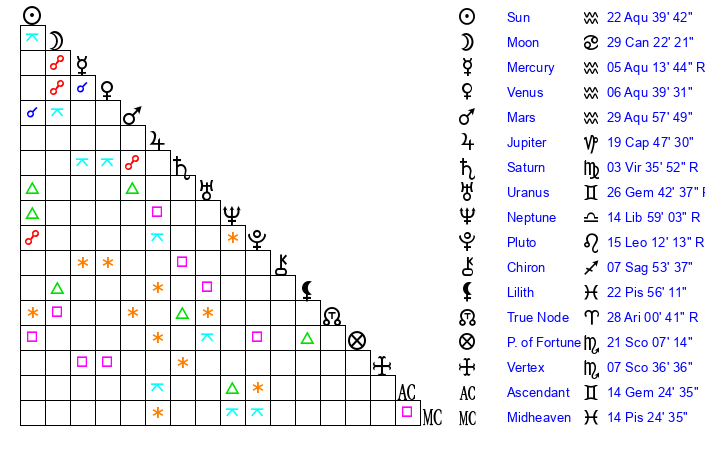 | Neptune | 14 Libra 58 | 28 Pisces 17 | 13 Libra 8 |