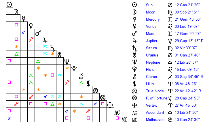 | Sun | 12 Cancer 21 | 12 Cancer 58 | 25 Virgo 26 |