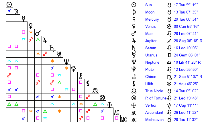 | Sun | 17 Taurus 59 | 18 Taurus 21 | 1 Leo 40 |
