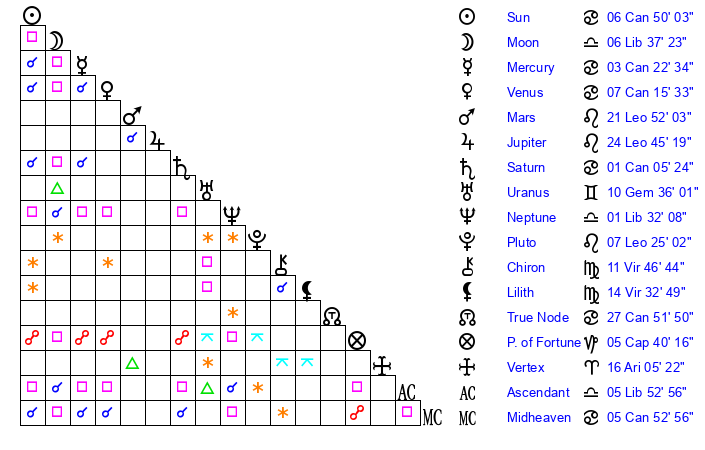 | Moon | 6 Libra 32 | 19 Leo 48 | 26 Virgo 40 |