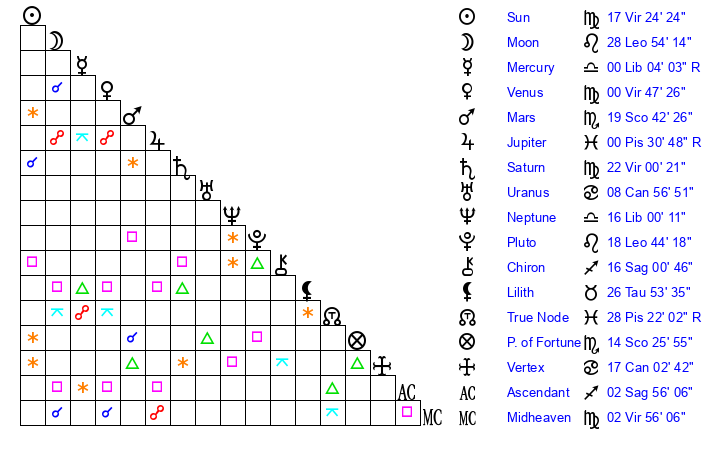 | Sun | 17 Virgo 24 | 18 Virgo 14 | 1 Sagittarius 51 |